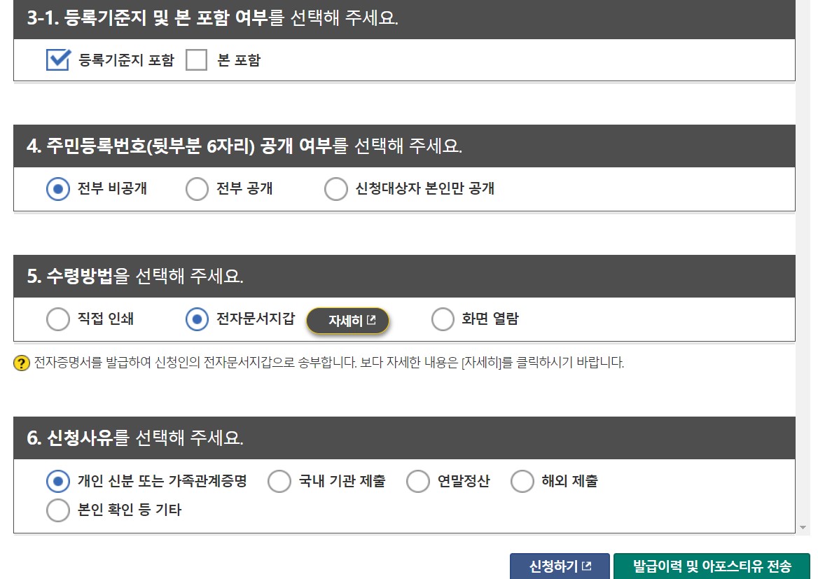 가족관계증명서의 특성상 발급 과정에서 필요한 정보인데 이때, 입력해야 할 추가 정보 본 표함 여부를 확인해주시고 클릭하시면 됩니다. 그리고 수령방법은 직접인쇄 및 전자문서로 확인해주세요.