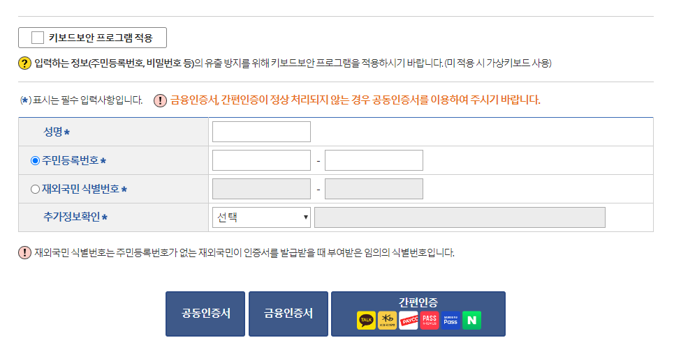 가족관계증명서를 인터넷으로 발급받으시려면, 먼저 가족관계증명서 인터넷발급 메뉴로 이동후 메뉴를 보시면 개인 인증 화면이 나타나게 되는데, 이 화면에서는 공동인증서, 금융인증서, 간편 인증 중에서 하나를 선택하셔야 합니다.