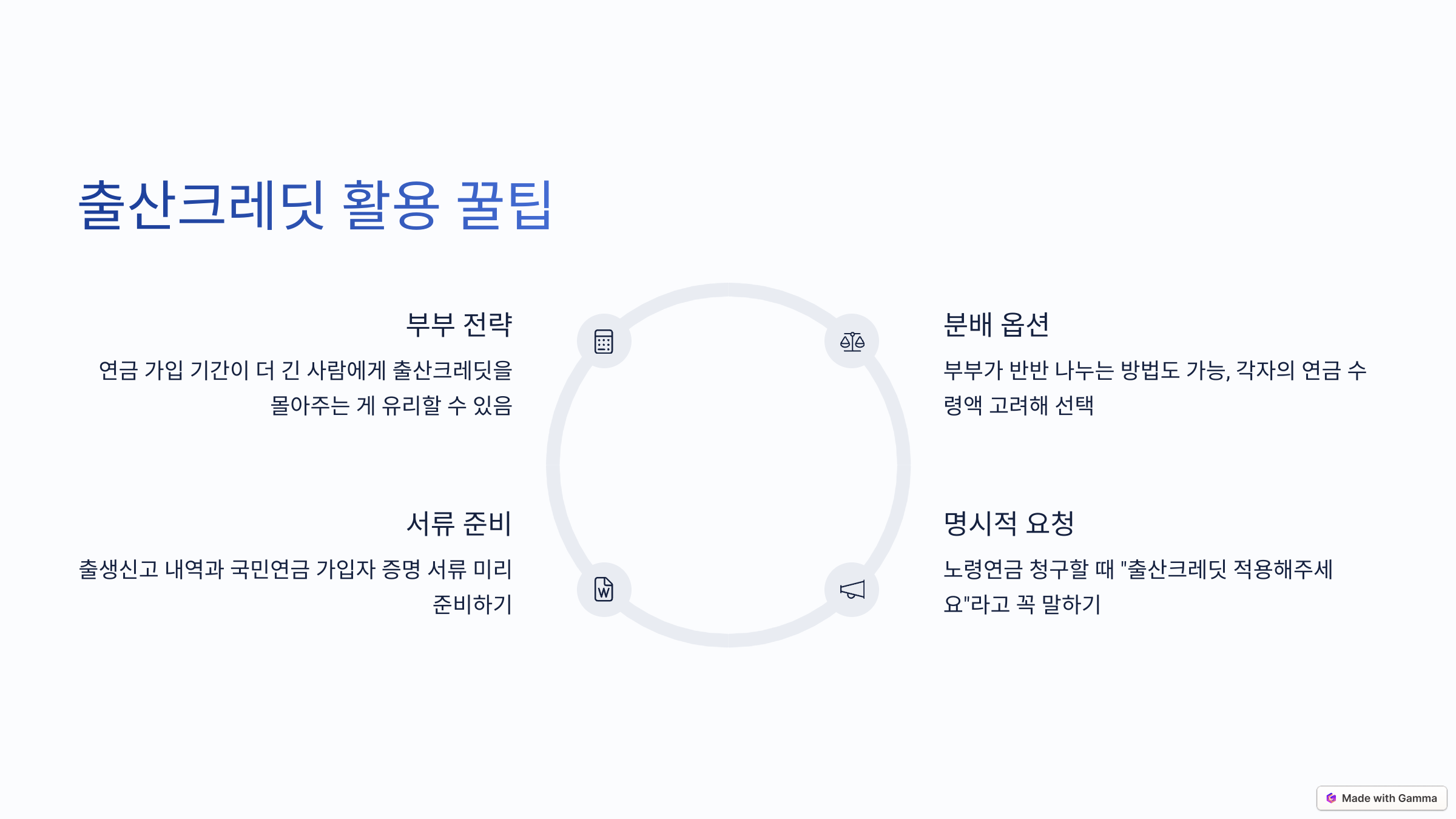 • 연금 가입 기간이 더 긴 사람에게 출산크레딧을 몰아주는 게 유리할 수도 있어요.