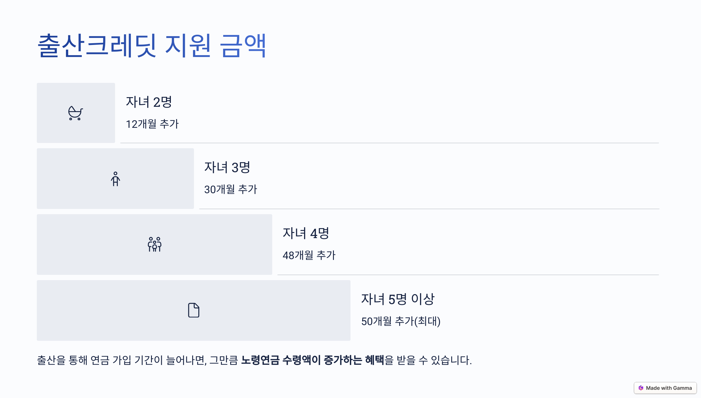 • 출산을 통해 연금 가입 기간이 늘어나면, 그만큼 노령연금 수령액이 증가하는 혜택을 받을 수 있습니다.