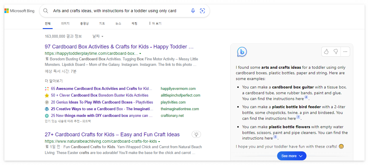 달리 우측에는 챗봇 형태의 답변이 등장한다 합니다.다만 모두가 챗GPT 기술이 접목된 bing빙은