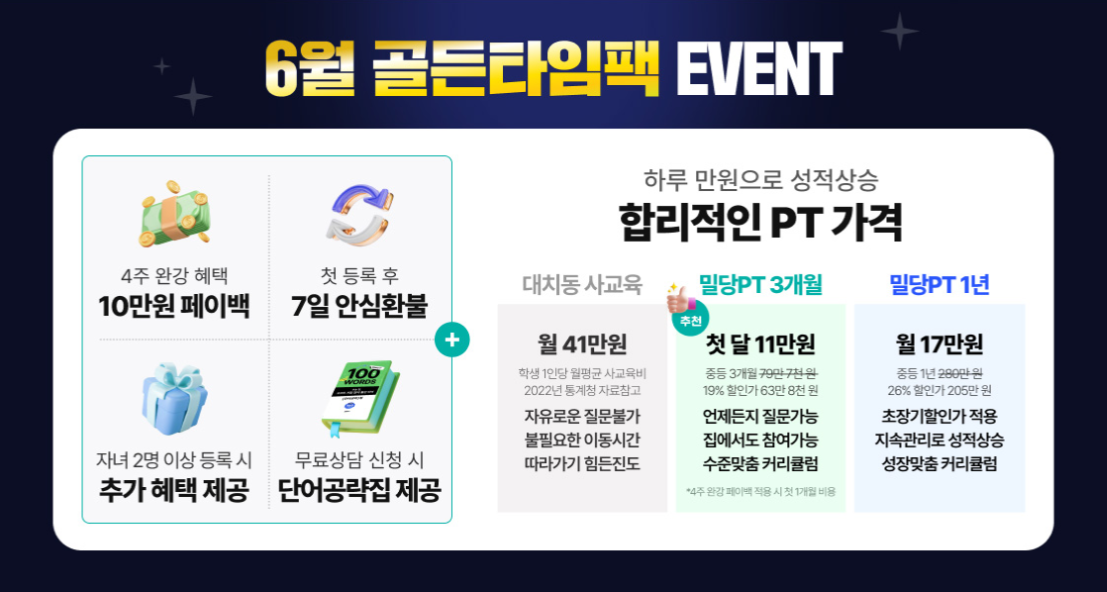 밀당PT는 타교육비보다 착한가격으로 제대로 된 피드백을 가르치고 있습니다. 또한 초창기 할인가를 만날수 있으니 아이들의 지속적인 관리 수업으로 7일동안 이용해 보시고 결정해보세요.시험 기간에만 바짝 공부해도 될까요?