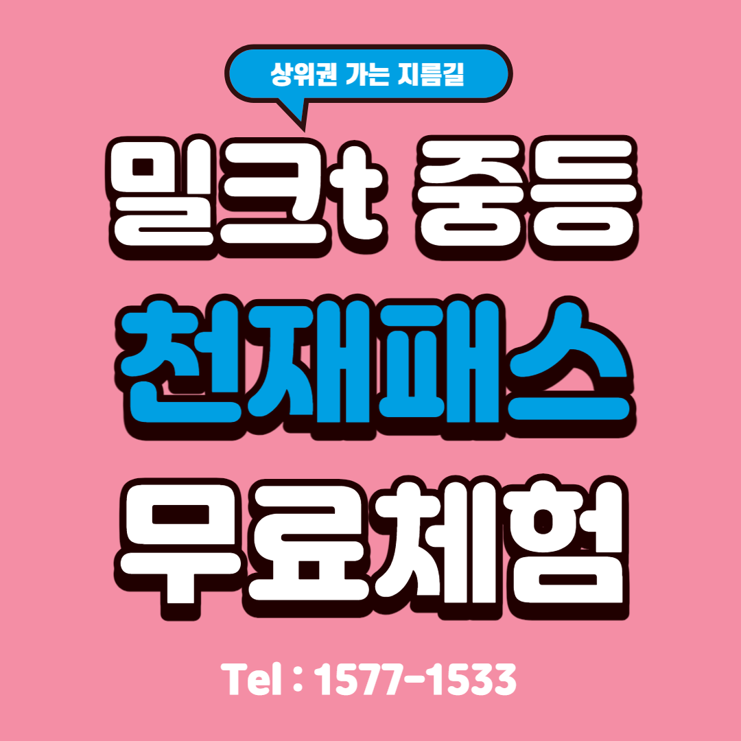 이런 학생들을 위해 밀크t에서 중등 천재패스 무료체험을 진행하고 있는데요. 중학교 공부는 초등학교와는 다르게 과목수도 많아지고 난이도도 높아지기 때문에 미리미리 준비해야 되는데요, 울아이 밀크t로 상위권 되게 해 준 중등 천재패스를 알아보겠습니다.