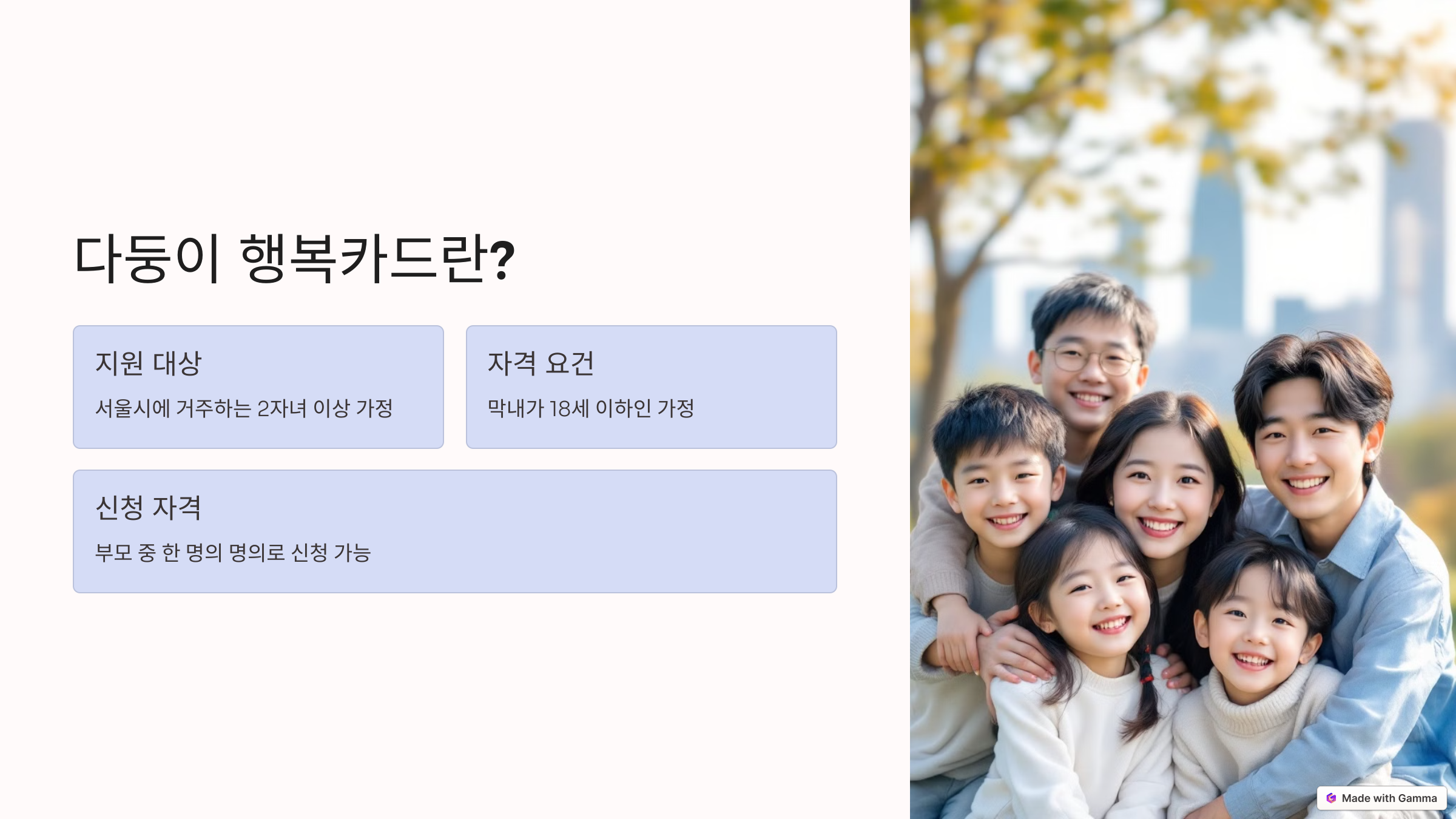 최근 육아 비용이 꾸준히 상승하면서 많은 가정이 경제적 부담을 느끼고 있습니다. 특히 자녀가 많은 다자녀 가정의 경우 더욱 큰 어려움을 겪고 있는데요. 이러한 가정을 지원하기 위해 서울시는 2007년부터 ‘서울시 다둥이 행복카드’를 제공해 왔습니다.