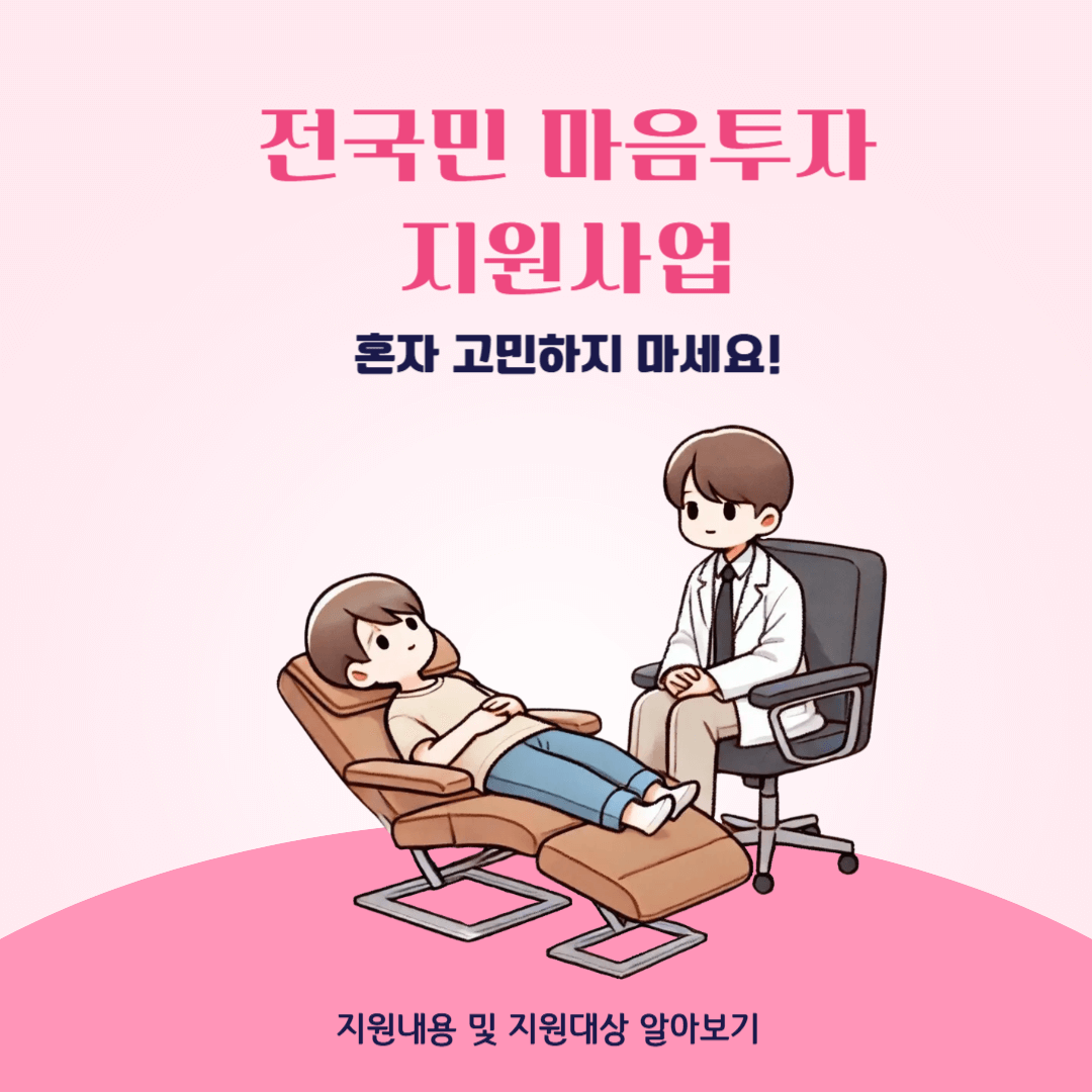 전국민 마음투자 지원사업은 모든 국민이 심리적 어려움을 극복하고, 자신의 마음에 투자할 수 있는 기회를 제공하는 국가 주도 프로그램입니다. 이 사업은 심리 상담, 정신 건강 교육, 치유 프로그램 등 다양한 서비스를 통해 국민의 전반적인 정신 건강 증진을 목표로 하고 있습니다.