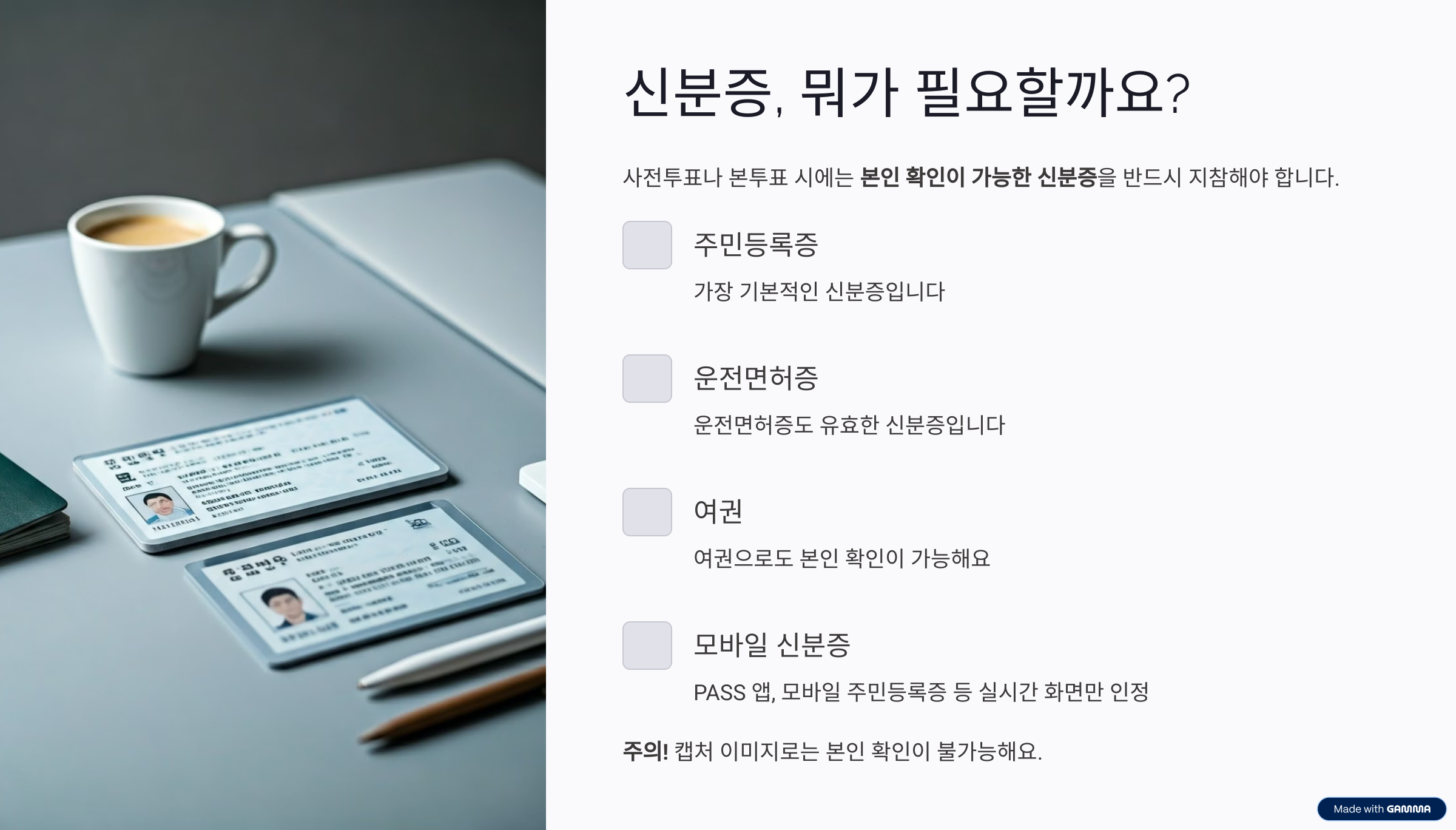 사전투표나 본투표를 하러 갈 때는 본인 확인이 가능한 신분증을 반드시 지참해야 해요.